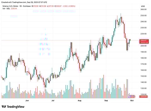 Solana price is currently $208. SOL has declined from $225 but recently recovered to $192. The price trades above the 100-hourly simple moving average. Resistance levels sit at $212, $215, and $220. If SOL closes above $220, it could retest $230 and even $242.
