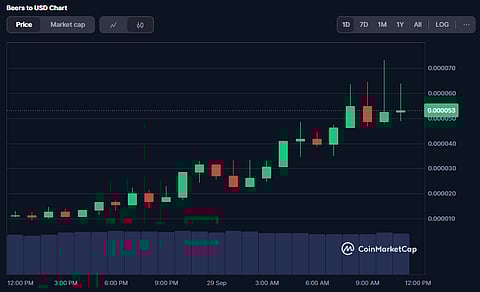 In the last 24 hours, the BEER token’s price saw a major surge, increasing by over 376%, from $0.00001005 to $0.000060 before dipping to $0.000053, which is where it sits at the time of writing.