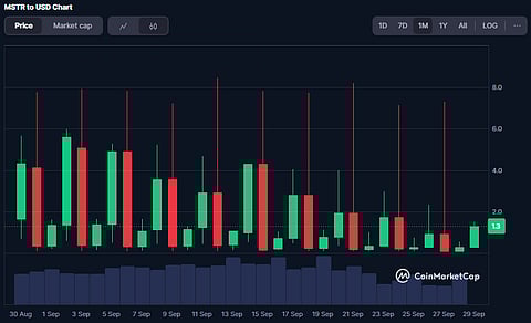 In the last 24 hours, it shot up by over 269%, with its price soaring from $0.2905 to $1.22. A few hours ago, MSTR even managed to reach $1.5, although its price then corrected to $0.77, only to surge again to where it is now.
