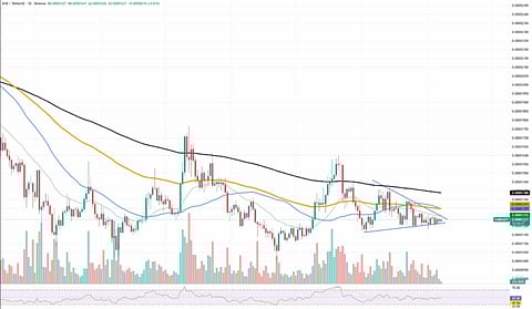 The Shiba Inu price has been stuck in a symmetrical triangle since mid-August, near 0.00001236. That squeeze often comes before a fast move. If buyers push through the top line, the Shiba Inu price could test 0.00001297 and then the 200-day EMA near 0.00001388. With strong volume, the Shiba Inu price may stretch toward the 0.00001450 to 0.00001500 zone that capped rallies in July.