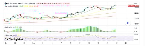 Solana trades just under $240, with recent sessions printing higher lows into resistance. A widely watched Solana price prediction path keeps the base case near a grind higher, with $244 feasible by mid-October if volume and on-chain activity stay firm.