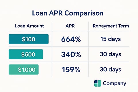 APRs range from 159% to 365% in most states, reaching 664% in Texas. You'll see your exact rate before accepting any loan.