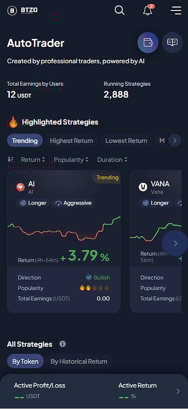 AutoTrader is the smart trading assistant of BTZO that enables users to carry out automatic trading plans without needing technical skills. The feature offers pre-configured plans devised by experts to help investors earn money from market trends 24/7.
